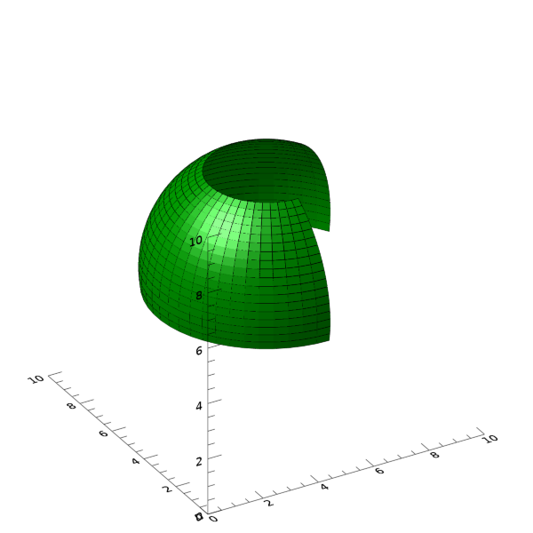 이제 앞서 생략했던 P1~P4 키워드들의 역할을 봅시다. 이 키워드들은 구현될 구체의 경도 및 위도 방향의 각도 범위를 설정하는 역할을 합니다. 앞선 예제들에서와 같이 이 키워드들을 전혀 사용하지 않을 경우에는 그냥 구면 전체를 구현해주는 디폴트 설정을 따르게 됩니다. 하지만 다음과 같이 P1, P2 키워드를 사용할 경우에는 경도 방향으로 어떤 각도 범위만큼만 구현할지를 결정할 수 있게 됩니다.