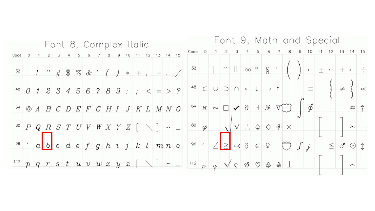 그러면 이번에는 특정한 번호의 허쉬 폰트에서 지원되는 문자들 중 특정한 문자 하나를 골라서 사용하고자 하는 경우를 생각해봅시다. 바로 앞서 사용했던 허쉬 9번 폰트에서 지원되는 문자들 중 "크거나 같은"의 의미를 갖는 기호(>=)를 골라서 사용하는 경우를 예로 들겠습니다. 실제로 허쉬 9번 폰트에서 지원되는 문자들의 목록을 보면 다음과 같습니다.