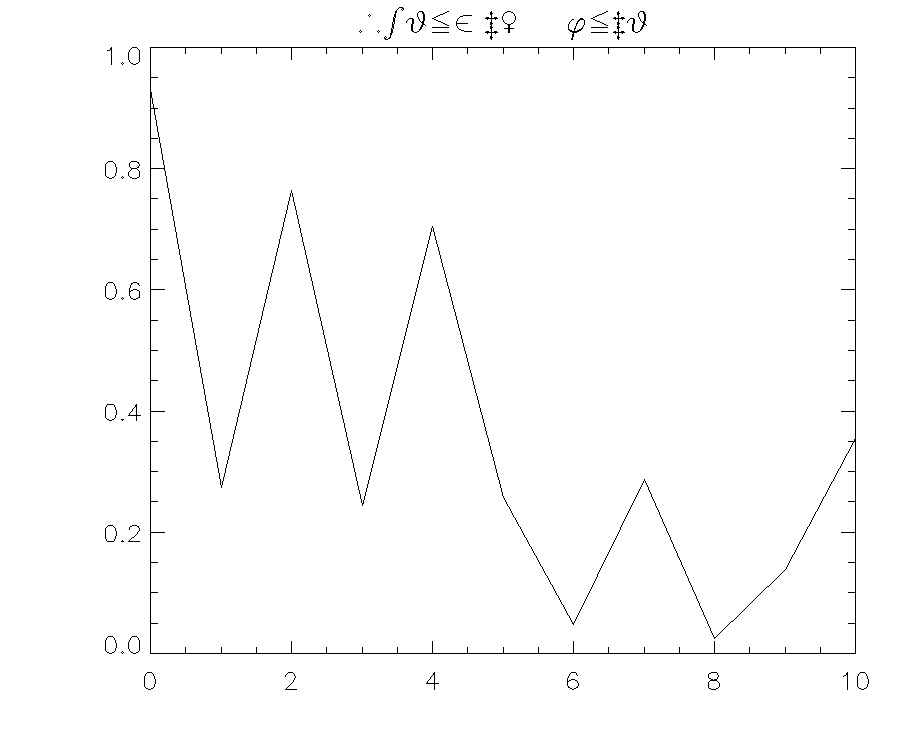 이와 같은 방식으로 3~20번까지 각각의 허쉬 폰트별로 문자 목록을 살펴보면서 내가 사용하고자 하는 문자들이 어디 있을지를 찾아볼 수 있습니다. 그런데 이와 같은 방식으로 내가 사용하고자 하는 문자들을 찾았을 경우 이를 IDL에서 어떻게 표시해야 할까요? 그 방법을 지금부터 살펴봅시다. 이를 위하여 다음과 같이 DG 체계에서 간단한 플롯을 표출하면서 타이틀 문자를 허쉬 폰트로 표시하는 예제를 보겠습니다.