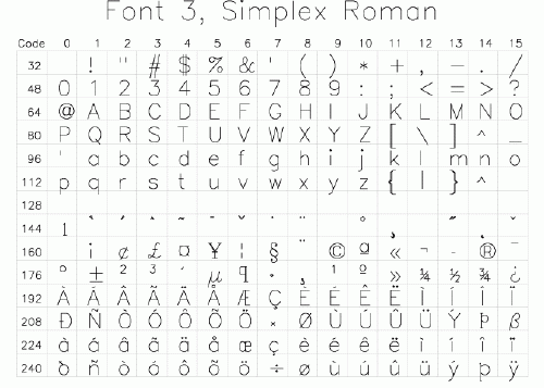 여기서는 SHOWFONT 명령에 대하여 폰트 번호를 첫번째 인수로 부여하고 두번째 인수로는 그냥 적당한 문자값을 부여하면 됩니다. 이러한 명령을 실행하면 그래픽창이 뜨면서 문자 목록이 표시됩니다. 그 모습은 다음 그림과 같습니다.