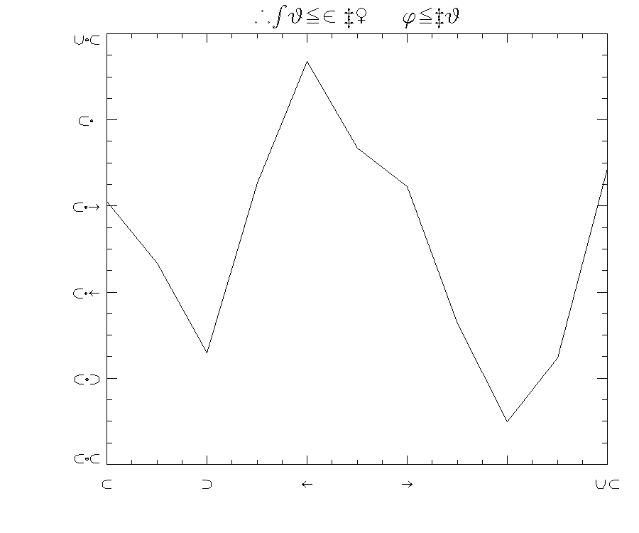 사실 이러한 결과들을 세부적으로 들여다보면, Title of My Plot이라는 문자열을 구성하는 각각의 개별 문자별로 고유의 코드번호가 있는데, 폰트 번호가 바뀌면 그 코드 번호에 대응되는 문자가 사용되기 때문에 이러한 다양한 결과들을 얻은 것이라고 보면 됩니다. 예를 들어 허쉬 9번 폰트(Math and Special)의 경우는 문자 구성표를 보면 각종 기호들 위주로 구성되어 있기 때문에, '!9Title of My Plot'로 표기하여 이 폰트를 사용할 경우에는 문자들이 이 폰트 구성표에서 대응되는 기호들로 표시될 것입니다. 그 모습은 다음 그림과 같습니다.