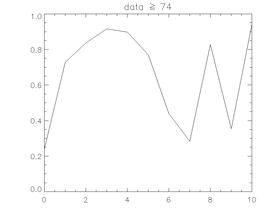 이 그림의 상단에 있는 타이틀 문자를 보면 data >= 74와 같은 내용이 표기되어 있습니다. 그런데 이 결과를 얻기 위한 과정을 보면, 이러한 표기를 하기 위해서 IDL 프로그램 내에서는 이 문자열을 다음과 같이 명시하였습니다.