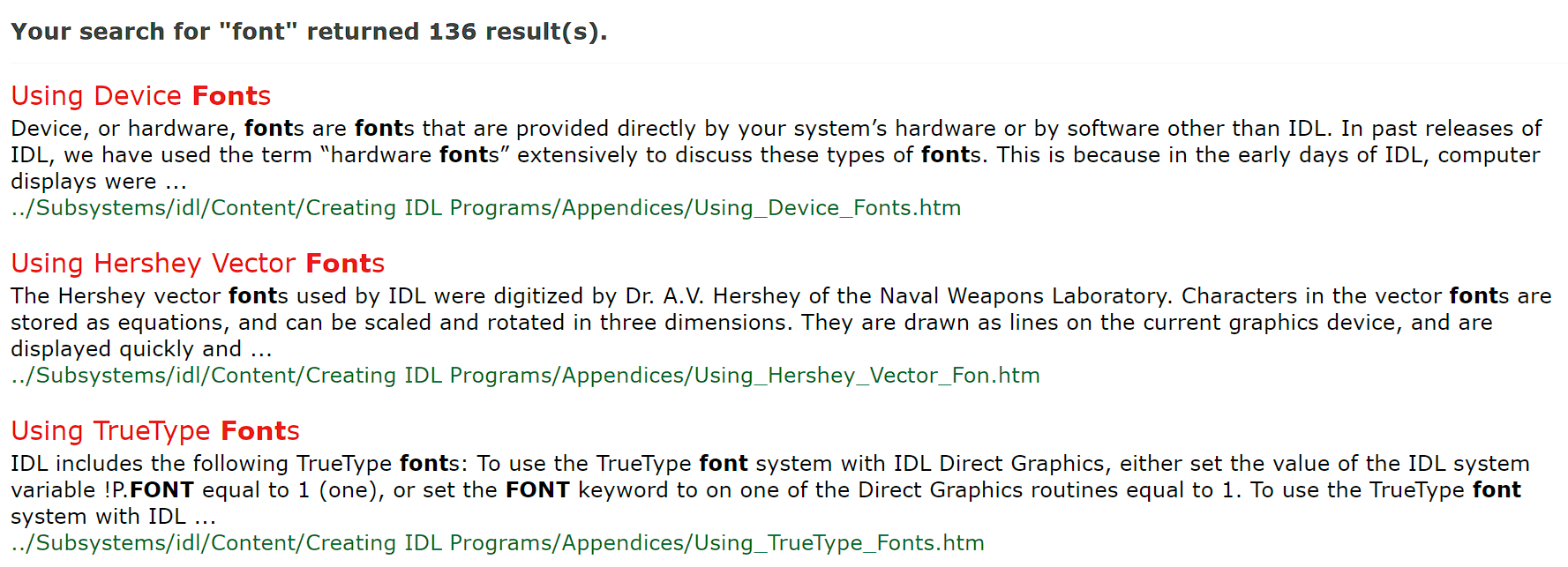 이와 같이 각각의 허쉬 폰트에서 지원되는 문자들의 목록은 IDL 도움말에서 볼 수 있습니다. IDL 도움말의 검색창에서 "font"로 검색을 해보면 다음과 같이 세 개의 검색 항목들이 뜨는데 이 중 "Using Hershey Vector Fonts"라는 항목을 클릭하면 됩니다.
