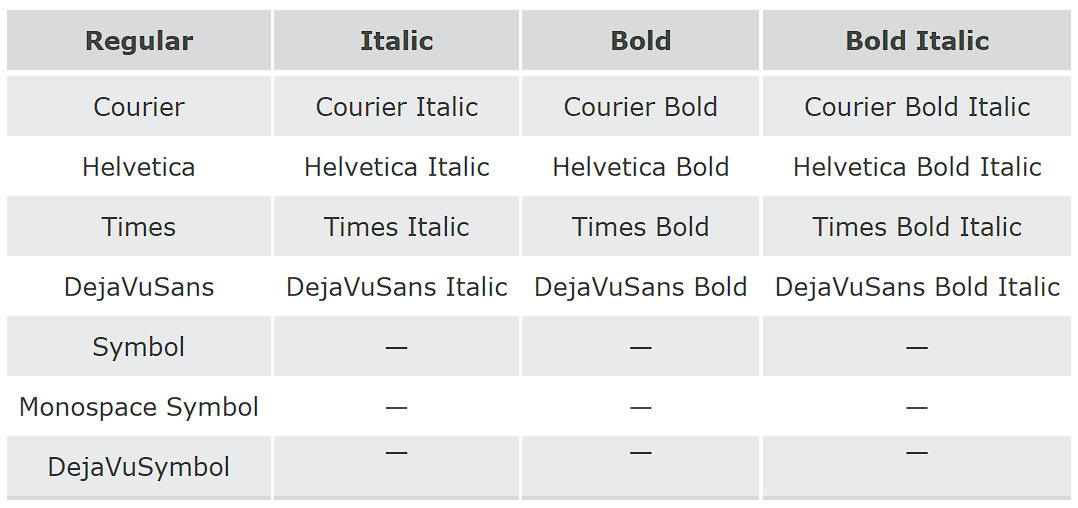 이와 같이 Courier, Helvetica, Times, DejaVuSans 등이 문자 표기에 있어서 주로 사용되는 폰트들입니다. 세부적으로는 볼드체와 이탤릭체 등으로 변형도 가능합니다. 트루타입 폰트는 DG 뿐 아니라 다른 그래픽 체계들(OG, NG)에서도 사용이 가능합니다. 각 그래픽 체계별로 트루타입 폰트를 사용하기 위한 설정법은 다음과 같습니다.