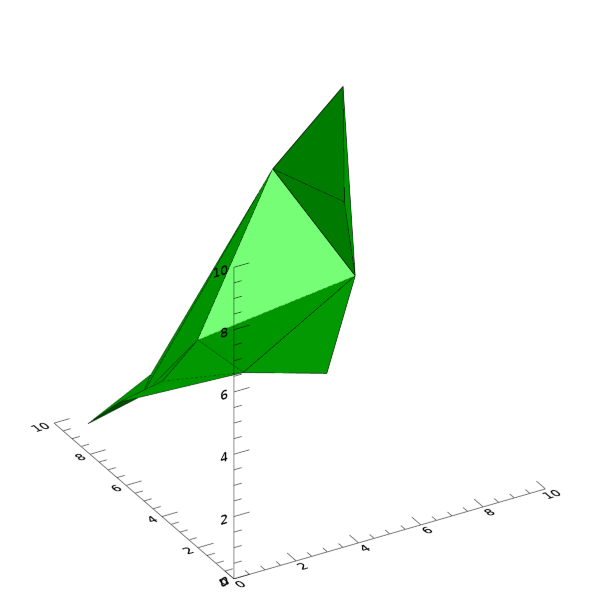 여기서는 PLOT3D 함수는 XYZ축으로 정의되는 3차원 공간만 표출하고 /NODATA 키워드를 사용하여 꼭지점들이 표시되지는 않도록 하였습니다. 그리고 이어서 POLYGON 함수를 사용함으로써 이 공간 내에 폴리곤의 형태가 표출되도록 하였습니다. 표출 결과는 다음 그림과 같습니다.
