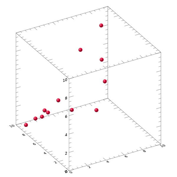 일단 12개의 꼭지점들을 살펴보면 이들의 X, Y, Z 좌표값들은 각각 xv, yv, zv로 정의되어 있습니다. 이들의 분포 위치는 대략 X, Y, Z 방향으로 0~10의 범위를 갖습니다. 일단 먼저 이 꼭지점들의 위치 분포를 보는 것이 좋을 것 같아서 다음과 같이 PLOT3D 함수를 사용하여 가시화해봅시다.