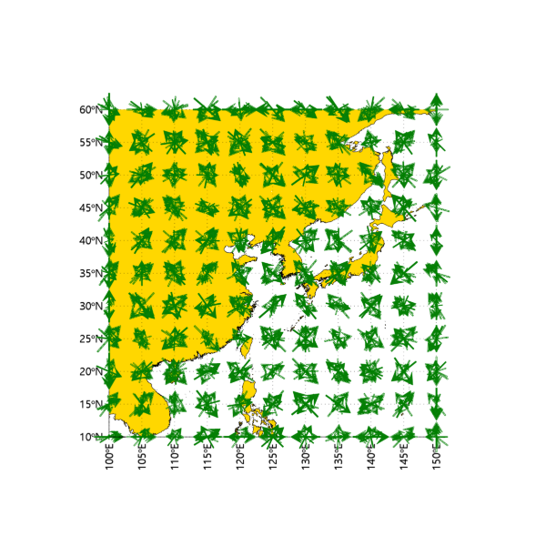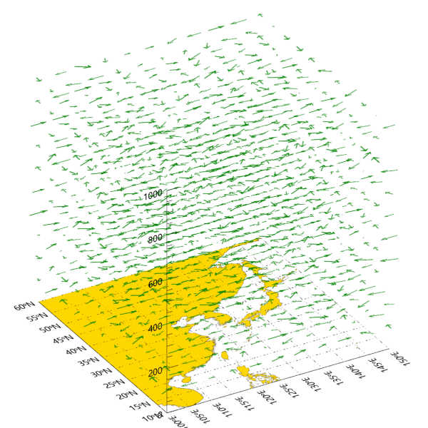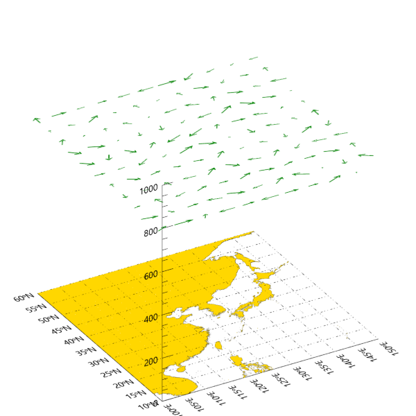 이와 같이 XYZ 공간의 XY 평면 상에 바탕 지도를 표출하는 것까지는 구현을 했습니다. 이제 그 다음에는 벡터장을 그 위에 중첩하여 표출해보려고 합니다. 이를 위해서는 VECTOR 함수를 사용하여 층(Layer) 하나씩 표출하는 방식으로 가야합니다. 즉 앞서 예제 데이터를 생성할 때 u, v를 3차원 배열로 생성을 하긴 했지만 이 상태 그대로는 VECTOR 함수에 바로 투입할 수 없습니다. 왜냐하면 VECTOR 함수 자체는 2차원적인 표출만 가능하며 2차원적인 데이터만 받을 수 있다는 특성 때문입니다. 그래서 하나의 층(Layer)을 선택하여 그 층에 대한 2차원적인 데이터를 추출하고 이 데이터를 VECTOR 함수에 투입하여 표출하는 방식으로 가야합니다. 지금 우리가 사용중인 예제 데이터의 경우는 총 10개의 층들이 있으므로 그 중 하나의 층을 선택하여 처리해봅시다. 그 과정은 다음과 같습니다.