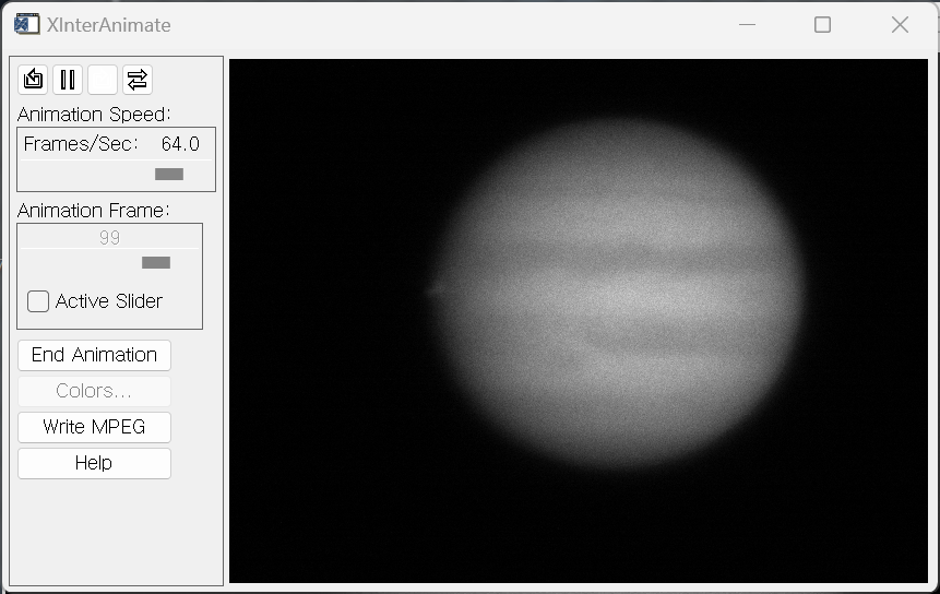 파일의 제목에서 짐작할 수 있듯이 목성(Jupiter)을 촬영한 스냅샷들 100개 중 하나입니다. 따라서 이 100개의 이미지들을 동영상의 형태로 볼 수 있다면 더 좋을 것입니다. 이를 위하여 IDL의 애니메이션 전용 명령인 XINTERANIMATE를 사용해봅시다. 그 과정은 다음과 같습니다.