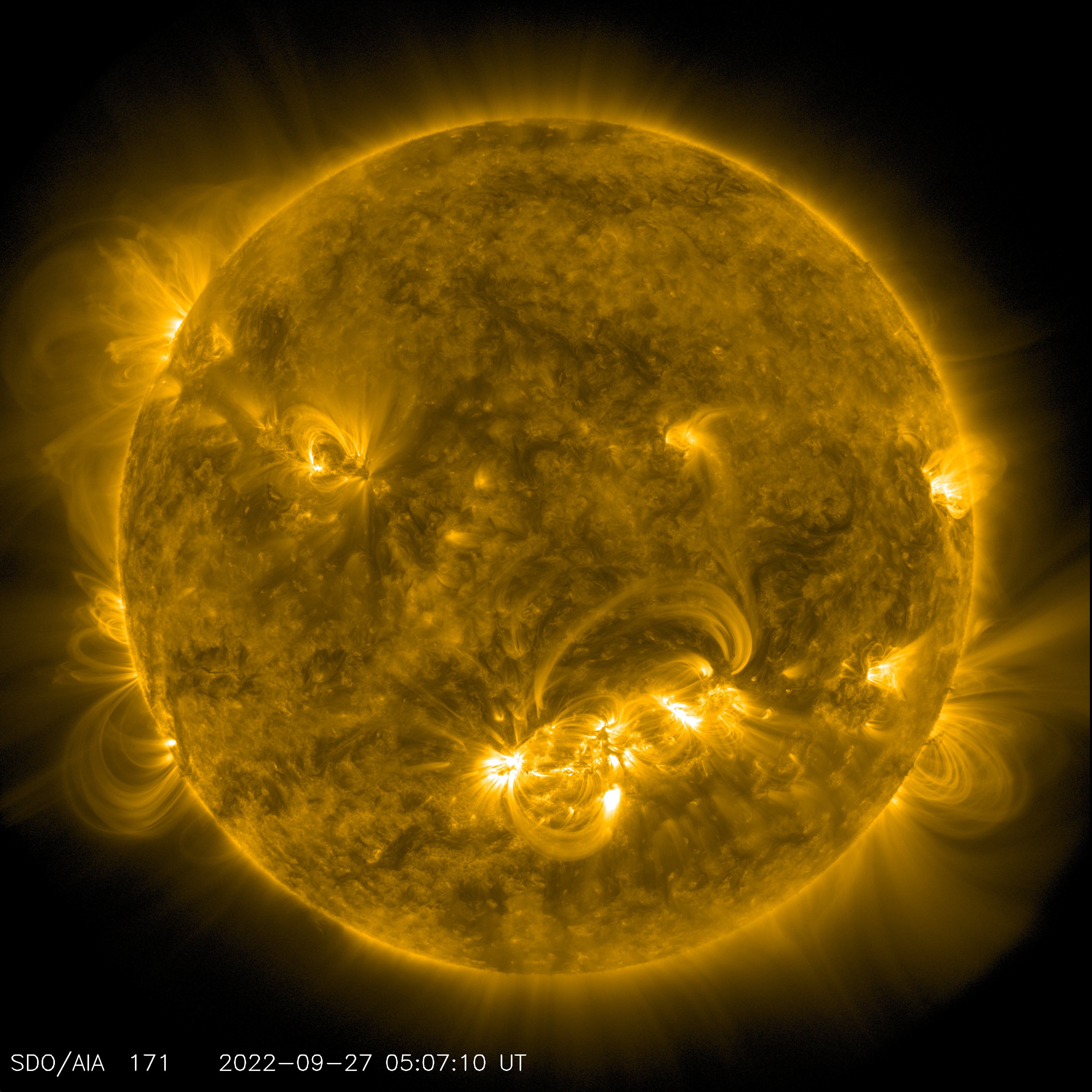 여기까지 2회에 걸쳐서 HSV 및 HLS 체계 기반으로 컬러테이블을 생성하는 방법을 소개하고 관련 예제들을 살펴보았는데요. 일단 두 체계 모두 색상의 다양성보다는 색상 자체의 명도 또는 채도 변화에 중점을 두는 컬러테이블의 생성에 더 효율적이라는 특성은 유사합니다. 다만 명도라는 개념이 두 체계에서 서로 차이가 나기 때문에, 사용자의 목적에 따라서 선택하여 활용하면 좋을 것 같습니다. 어쨌든 색상을 제한적으로 사용하면서 명도나 채도의 변화에 중점을 두는 컬러테이블도 데이터 표출에 있어서 종종 사용이 됩니다. 예를 하나 들어보자면, 주로 자외선(Ultraviolet) 영역의 파장들로 태양을 관측하는 SDO(Solar Dynamic Observatory)라는 관측위성이 있는데, 관측된 이미지들에 대한 처리 과정에서 아마도 이러한 컬러테이블이 사용되는 것이 아닐까 추측이 됩니다. 실제로 131 Angstrom 파장으로 관측된 SDO 태양 이미지를 보면 다음과 같습니다. NASA에서 공식적으로 공개하는 이미지입니다.