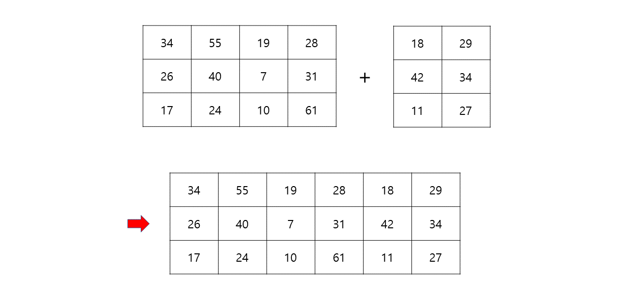 그러면 a와 b를 합쳐봅시다. 다만 여기서 고려해야 할 것은 4x3 배열과 4x2 배열을 합친다는 것은 결국 두번째 차원끼리 합쳐져서 4x5의 배열이 되도록 해야 한다는 것입니다. 즉 행(Column) 방향으로 크기가 더 커지는 효과가 됩니다. 일단 이 과정을 도식적으로 보면 다음 그림과 같습니다.