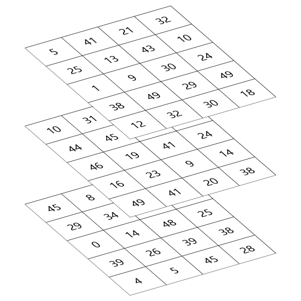 이러한 3차원 배열은 그 세부값들을 출력해보면 다음과 같이 각각의 층(XY 평면)별로 나타납니다.