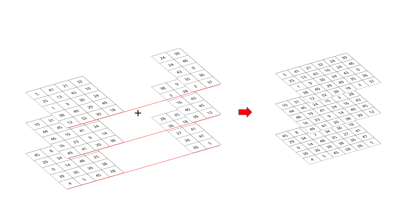 그러면 4x5x3인 배열 a와 4x5x2인 배열 b를 합쳐서 4x5x5의 배열 c를 얻는 과정이 됩니다. 결과를 얻기에 앞서서 이 과정을 도식적으로 본다면 다음 그림과 같습니다.