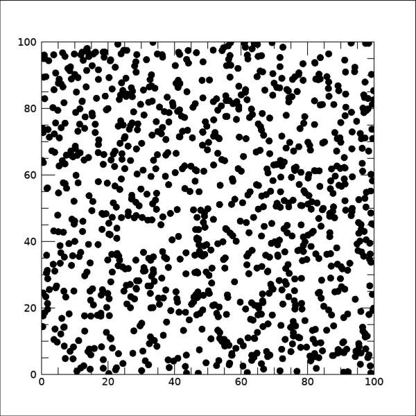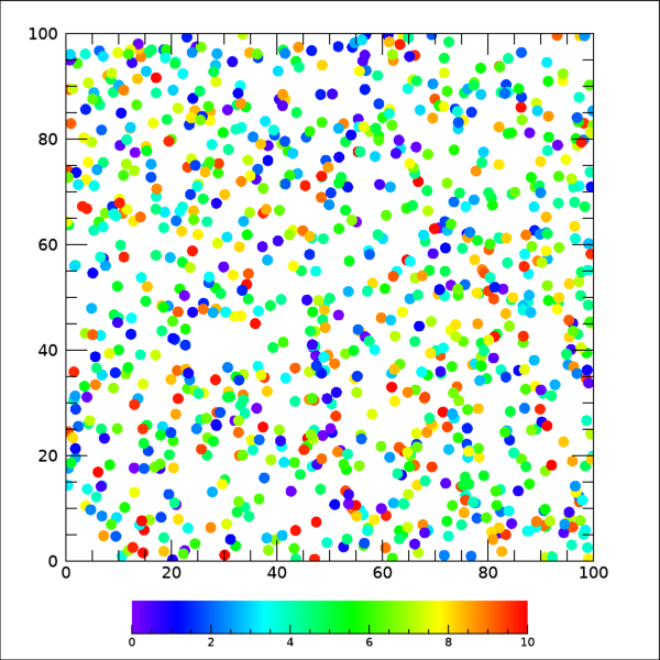 여기서는 1000개의 데이터 포인트들을 가정하고, 각 포인트에 대한 X 좌표, Y 좌표 및 데이터값에 해당되는 배열인 x, y, v를 생성한 것입니다. 이렇게 하면 X축 및 Y축 방향으로 0~100의 범위의 좌표가 되고 각 포인트의 데이터 값은 0~10의 범위를 갖게 됩니다. 이제 2차원 공간상에서 이 데이터 포인트들을 표출하기 위하여 다음과 같이 SCATTERPLOT 함수를 활용해봅시다.