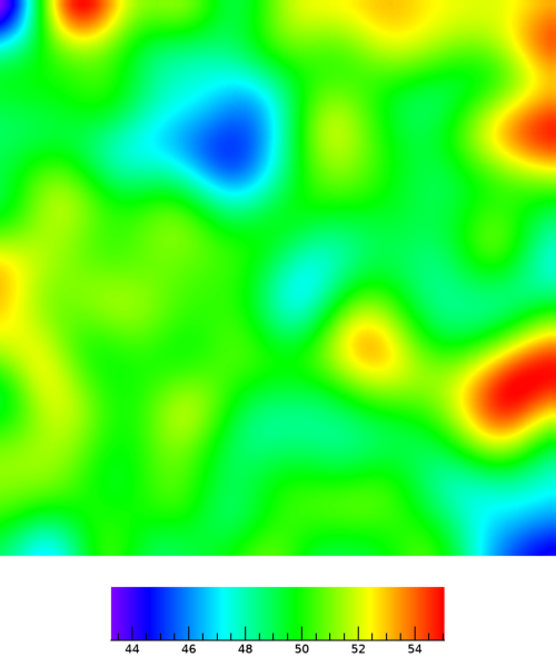 이 데이터는 500x500의 구조를 가지며 값의 범위는 대략 43~55 정도입니다. 그 모습은 34번 컬러테이블로 보면 다음과 같습니다.