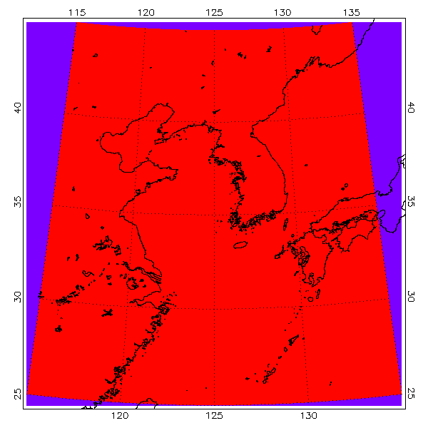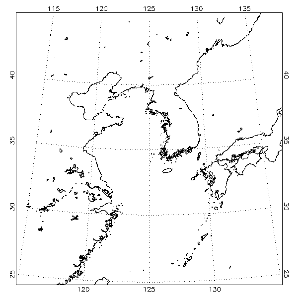 여기서 가장 먼저 사용된 MAP_SET 프로시저는 DG 체계에서 지도를 표출할 때 기본적인 체계를 구축하는 역할을 하는데 주로 지도의 투영법 및 경위도 범위 등을 설정하는 역할을 합니다. 물론 MAP_SET 명령만으로는 지도의 표출이 완결되지는 않으며 MAP_CONTINENTS, MAP_GRID 등의 프로시저들을 추가적으로 사용하는 것이 반드시 필요합니다. 어쨌든 여기서는 LCC 투영법의 지도를 표출하였는데 경도 방향으로는 +115~+135이고 위도 방향으로는 +25~+45의 범위가 되도록 설정하였습니다. 이어서 MAP_CONTINENTS 프로시저를 사용하여 대륙경계선이 표시되도록 하고, MAP_GRID 프로시저를 사용하여 경위도 격자선 및 박스형 윤곽도 표시되도록 하였습니다. 표출 결과는 다음과 같습니다.