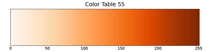 이 그림을 보면 등위선의 색상 처리에 있어서 CONTOUR 함수가 디폴트로 작동하는 방식을 알 수 있는데요. 이와 같이 등위선의 값에 따라 약간 브라운색 계열의 색상들로 차등적으로 적용된 것이 보입니다. 사실 정확히 얘기하면 55번 컬러테이블이 적용되면서 각 등위선의 값에 따라 적절한 위치의 색상이 적용되는 것이 디폴트 설정입니다. 즉 대상 데이터의 값 범위가 0~120이고 그 범위 내에서 30, 50, 80, 100이란 값의 위치에 맞는 색상들이 55번 컬러테이블에서 적절히 알아서 선택되어 적용된 것입니다. 55번 컬러테이블의 모습을 보면 다음과 같습니다.