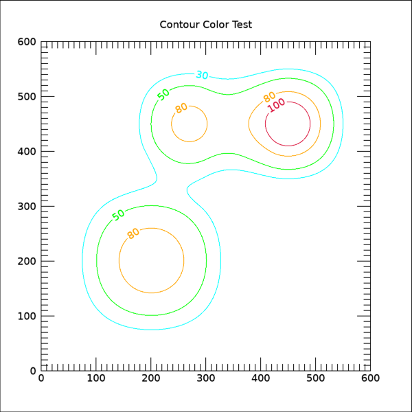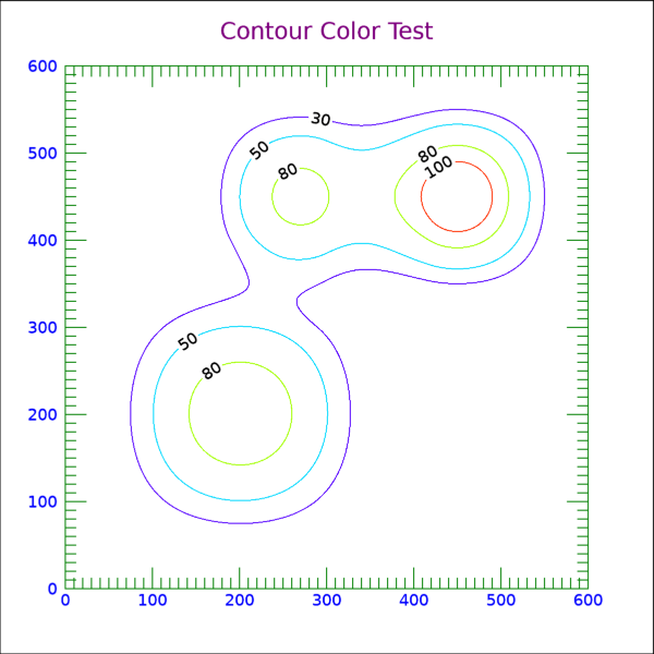 여기서는 등위선으로 표시된 4개의 값들(30, 50, 80, 100)에 대하여 각각 cyan, lime, orange, crimson 색상이 적용되도록 하기 위하여 C_COLOR 속성을 사용하였습니다. 결과는 다음 그림과 같습니다.