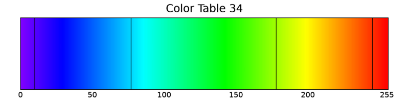 이 그림에서 각 등위선마다 적용된 색상은 실제로 34번 컬러테이블 내에 있는 것들입니다. 여기서 잠시 우리가 맨 처음에 색상에 대한 설정을 전혀 하지 않고 그냥 디폴트로 처리되도록 했을 때 표출되었던 그림을 다시 떠올려봅시다. 그 때 디폴트 상태에서 55번 컬러테이블이 적용된다고 언급한 바 있습니다. 결국은 디폴트인 55번 컬러테이블 대신 유저가 원하는 컬러테이블을 직접 지정하고자 할 때 RGB_TABLE 속성을 사용하면 된다고 보면 됩니다. 실제로 위의 그림이 표출되는 과정에서 적용된 34번 컬러테이블의 모습을 보면 다음과 같습니다.