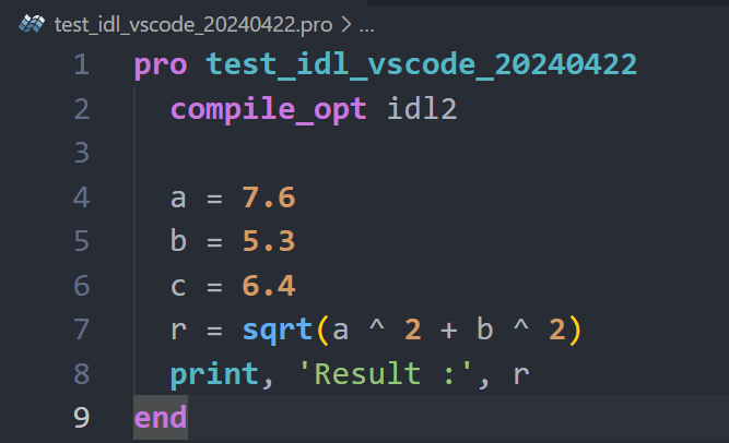물론 프로그램의 내용 자체는 달라진 것이 아니지만, 프로그램의 내용 문구를 표기하는 형식(Format)이 자동으로 변경된 것입니다. 이것은 앞서 VSCode 환경에서 작성 및 편집되는 IDL 프로그램의 표기 형식을 IDL for VSCode 확장 모듈이 직접 제어하도록 설정해둔 상태이기 때문에 이와 같이 VSCode가 알아서 형식을 제어한 것입니다. 잘 보면 소문자의 표기, 띄어쓰기 등에 대한 설정 뿐 아니라 compile_opt idl2라는 명령이 사용된 것 등이 모두 이러한 변경사항들에 해당됩니다. 그래서 이와 같이 VSCode 환경에서 프로그램 내용 문구의 표기 형식이 자동으로 제어되는 것이 유저 입장에서는 괜찮을 수도 있고 그렇지 않을 수도 있습니다. 만약 유저 나름대로 자신만의 표기 방식을 선호하는 경우에는 이러한 설정이 거추장스럽게 느껴질 것입니다. 다만 여기서는 이후의 설명을 위하여 이렇게 자동 형식 설정 기능이 활성화된 상태로 계속 진행해보겠습니다. 그러면 위와 같이 프로그램 파일(.pro)이 저장된 상태에서 프로그램 내용의 표기 형식이 자동으로 변경된 상태인 것을 편집창에서 확인할 수 있는데요. 그런데 실제로는 대다수의 유저들에게는 위의 편집창의 모습이 다음과 같이 아마 다음과 같이 보일 것입니다.