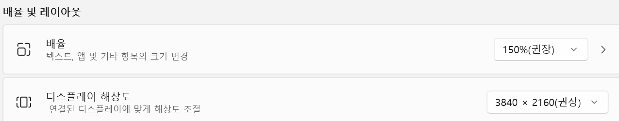 일단 이러한 앱 스케일링 기능은 MS Windows OS의 디스플레이 설정에서 화면 해상도 뿐 아니라 배율에 대한 설정까지도 가능한 것과 연관이 있습니다. 실제로 이러한 설정 기능은 다음과 같은 형태로 지원됩니다(윈도우즈 11 기준).