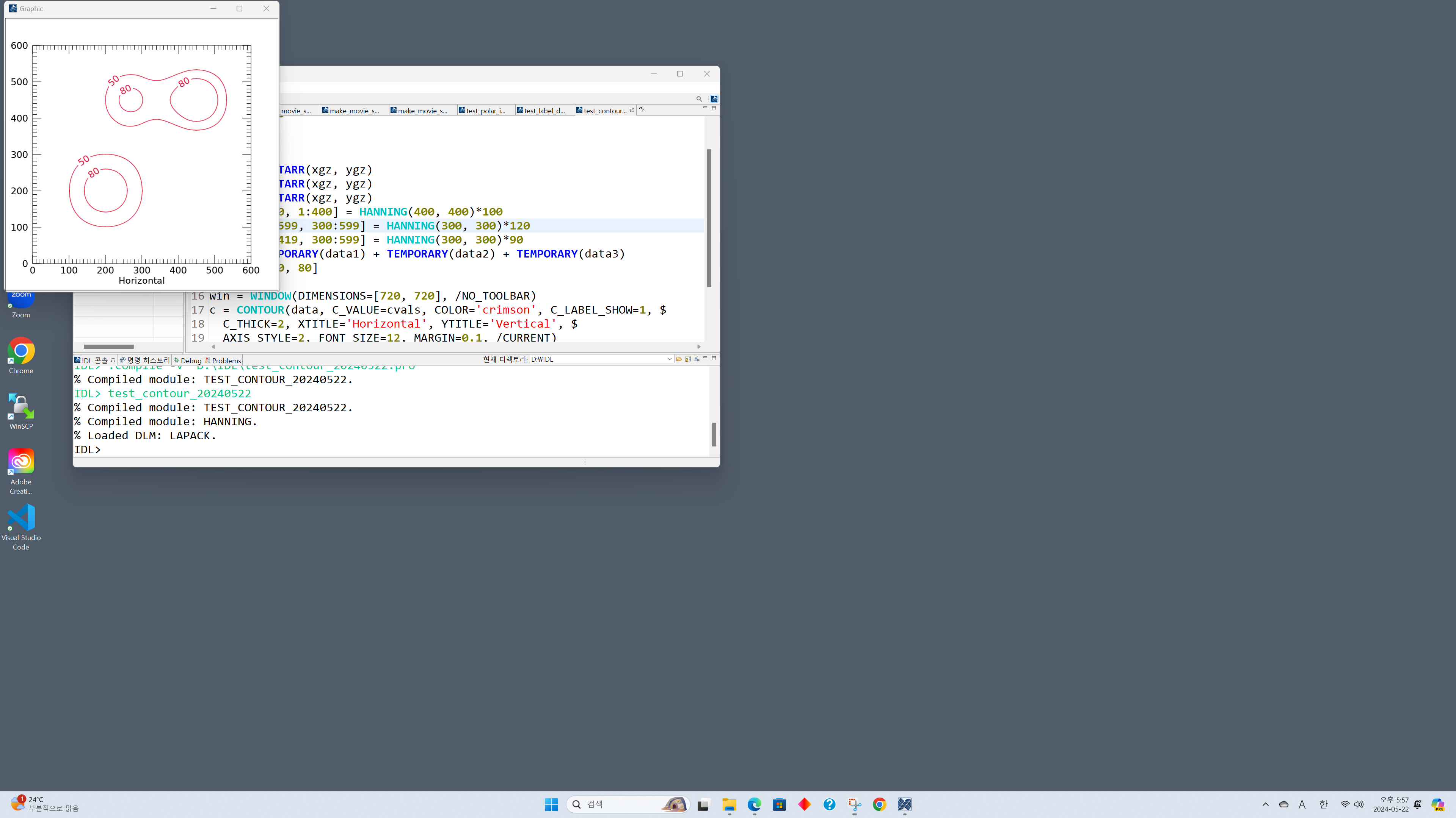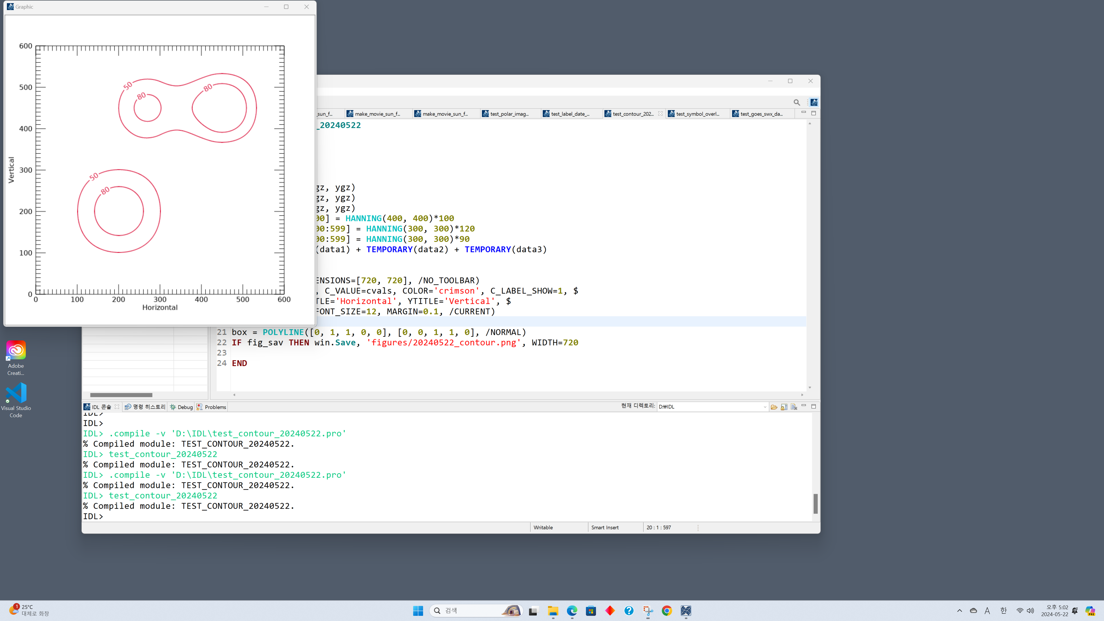 일단 여기서는 그래픽 창의 크기를 720x720으로 정의하였고 그림 내부의 문자들의 폰트 크기는 12로 설정하였습니다. 이제 앞서 언급한 것과 같은 화면 해상도 및 배율인 상태에서 IDL 9.0을 실행하고 이 프로그램을 실행하여 그림을 표출한 모습을 전체 화면으로 캡쳐한 모습은 다음과 같습니다.