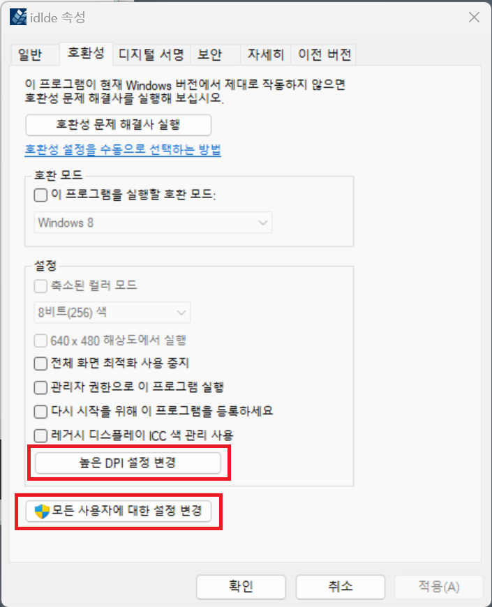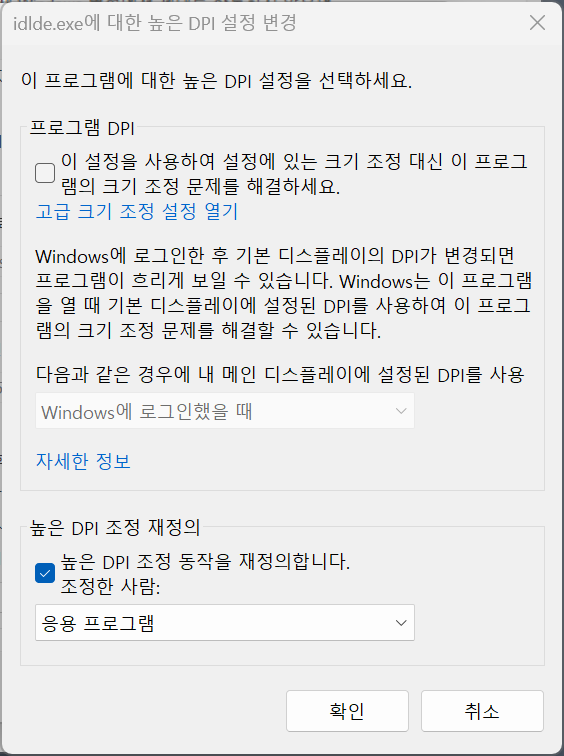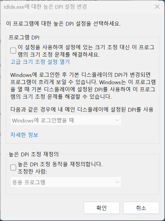 여기서 맨 하단에 보이는 "높은 DPI 조정 재정의" 섹션의 체크 버튼을 봅시다. 만약 이전에 이 설정을 변경한 적이 없다면 위와 같이 체크가 되지 않은 상태일 것입니다. 즉 체크가 되지 않은 상태가 앱 스케일링에 대응되도록 하는 상태입니다. 따라서 앱 스케일링 대응 기능을 비활성화하려면 이 체크 버튼을 다음과 같이 체크하고 확인 버튼을 누르면 됩니다.