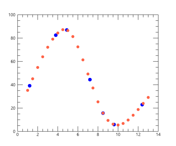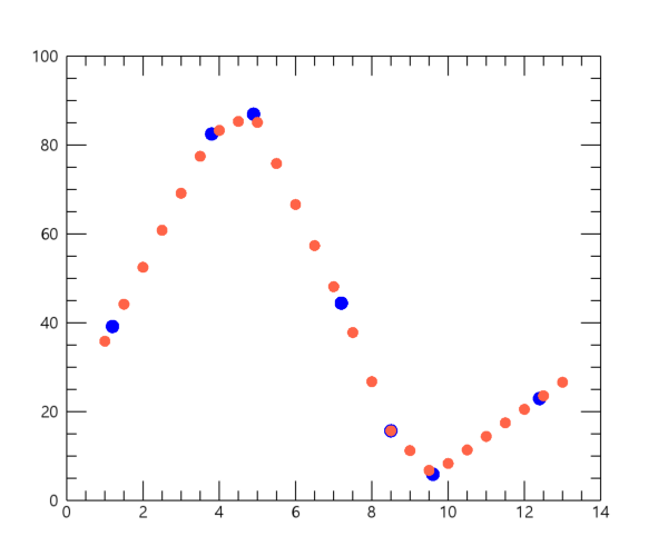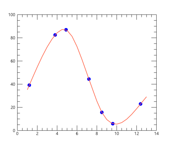 이 결과를 보면 앞서 INTERPOL 함수의 디폴트 설정인 선형 내삽에 의하여 얻은 결과에 비해서는 원래의 데이터 포인트들을 좀 더 부드럽게 이어주는 내삽 결과를 얻은 것 같습니다. 만약 위의 내용에서 새로 중첩되는 플롯을 심볼 대신 선의 형태로 바꿔보고자 한다면 위의 PLOT 함수가 사용된 내용만 대략 다음과 같이 변경해주면 됩니다.