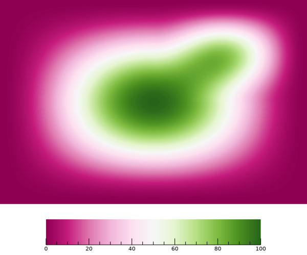 여기서는 600x400의 구조를 갖고 값의 범위가 0~100인 2차원 배열 data를 생성합니다. 그리고 적절한 크기의 그래픽창을 띄우고 이미지 및 컬러바를 표출합니다. 다만 컬러테이블의 경우는 COLORTABLE 함수를 사용하여 정의된 ct를 IMAGE 함수의 RGB_TABLE 속성에 부여하는 방식으로 적용하였습니다. 물론 컬러테이블의 적용을 위해서는 그냥 RGB_TABLE 속성에 바로 67이라는 값을 부여해도 되긴 하지만, 어차피 이어서 소개될 예제들에서 COLORTABLE 함수를 계속 활용하게 될 것이므로 위와 같이 처리하였습니다. 일단 표출 결과는 다음과 같습니다.