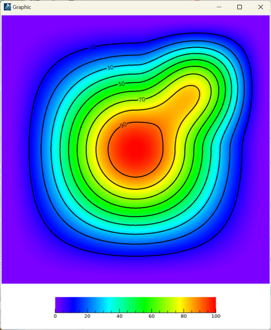 여기서는 가상의 2차원 배열인 data를 생성하고, WINDOW 함수로 그래픽 창을 띄워서 이미지로 표출하고 그 위에 등위선을 중첩하기 위하여 IMAGE 및 CONTOUR 함수를 사용하였습니다. 또한 COLORBAR 함수를 사용하여 하단에 컬러바도 표시하였습니다. 일단 이 과정에 의하여 그림이 표출된 그래픽 창의 모습은 다음과 같습니다.
