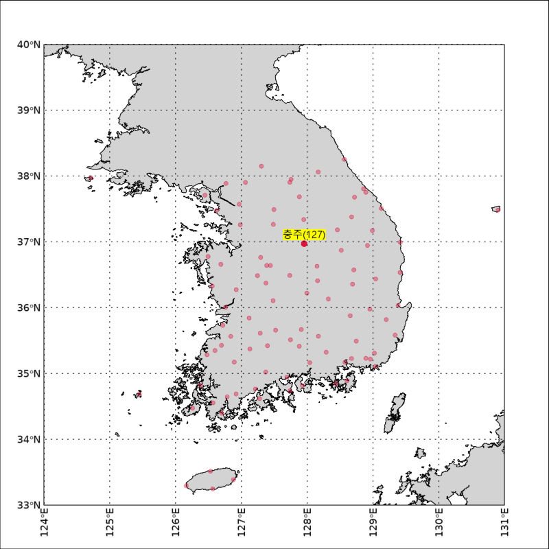 이와 같은 방식으로 97개의 ASOS 지점들의 위치 분포를 한반도 지도상에서 확인할 수 있는 그림을 얻을 수 있습니다. 그러면 여기서 한 단계만 더 나아가봅시다. 이번에는 특정한 하나의 지점에 대하여 그 지점번호 및 지점명을 함께 표시하도록 해보고자 합니다. 예를 들어서 127번 충주 지점을 그 대상으로 해봅시다. 여기서는 대상 지점의 원형 기호는 정상적으로 표시하되 나머지 지점들에 대해서는 어느 정도 투명하게 보이도록 처리해보고자 합니다. 이를 위하여 먼저 앞서 제시되었던 예제 코드의 내용에서 SCATTERPLOT 함수가 사용된 부분만 다음과 같이 수정해봅시다.