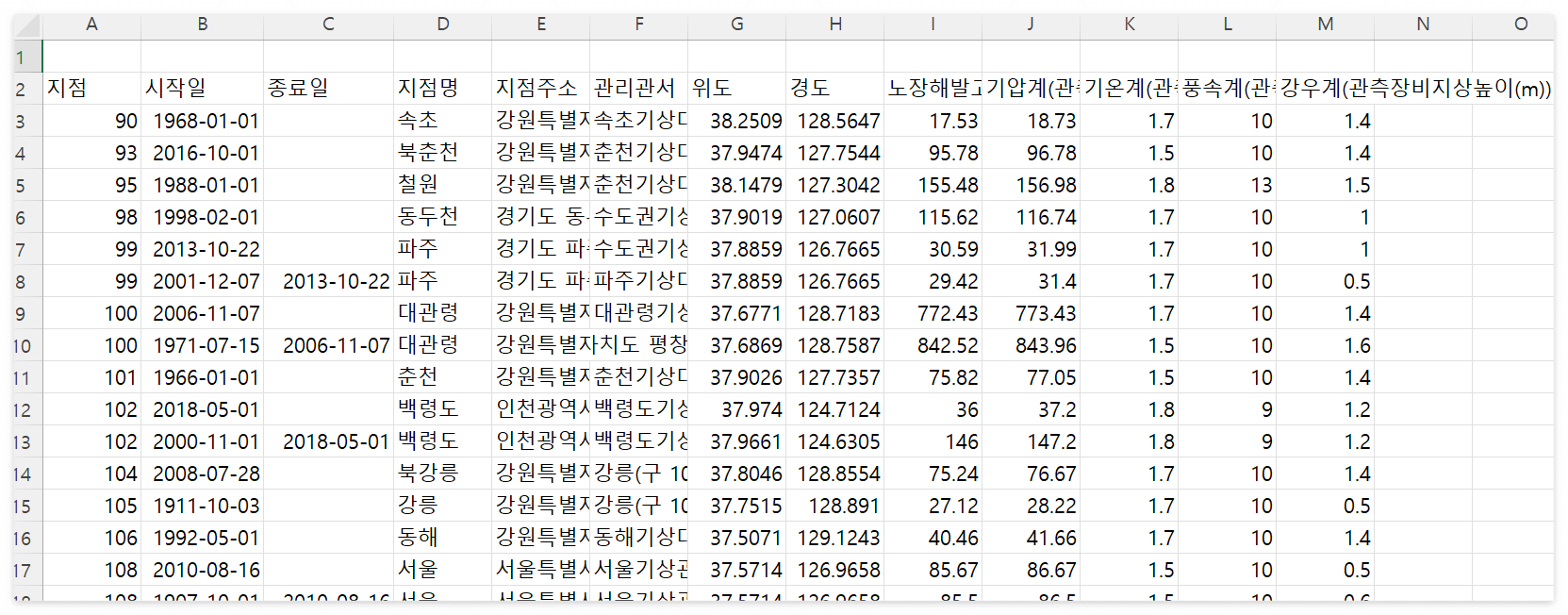 이 자료는 엑셀 파일로 받을 수 있는데 IDL에서 원활한 처리를 위해서는 XLS 보다는 CSV 파일로 받아야 합니다. 이를 위해서는 우측 하단에 보이는 CSV 버튼을 누르면 됩니다. CSV 파일은 기본적으로는 텍스트 파일이며 각 라인에서는 값들이 코마(,)로 분할되어 있습니다. 그리고 일반적인 텍스트 에디터 앱으로도 읽을 수 있고 물론 엑셀에서도 읽을 수 있습니다. 제가 받았던 ASOS 지점 메타자료 CSV 파일을 엑셀로 열어본 모습은 다음과 같습니다.