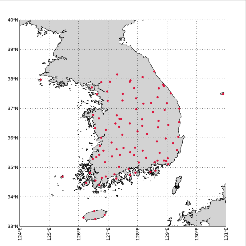 이제 이와 같이 현재 유효한 ASOS 지점들 97개에 대한 지점번호, 지점명, 경도, 위도 정보들이 확보되었으므로 이러한 지점들의 분포를 한반도 지도 상에 표시하는 작업을 진행해봅시다. 이 작업은 먼저 한반도 영역을 커버하는 지도를 표시한 다음 위의 배열들을 이용하여 각 지점들을 경위도 좌표 기반으로 표시하는 순서로 진행하면 되는데, 그 과정은 다음과 같이 처리해봅시다.