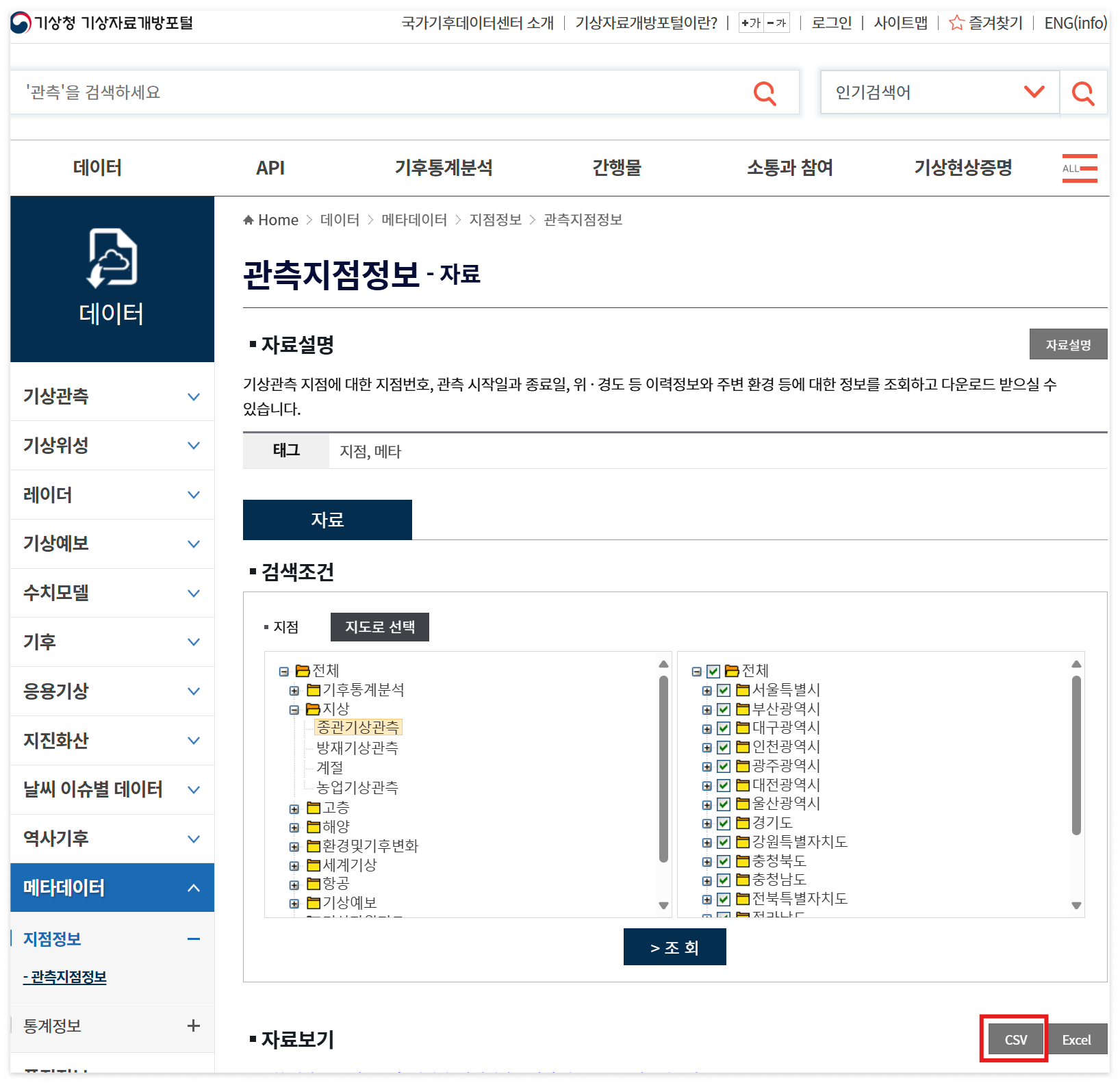 전국 97개 ASOS 지점들에 대한 분포 자료는 앞서 언급한 기상자료 개방포털 웹페이지에서 종관기상관측 지점정보 메타데이터 섹션에서 받을 수 있습니다. 해당 웹페이지에서 이러한 섹션을 찾아보면 그 모습은 대략 다음과 같습니다.