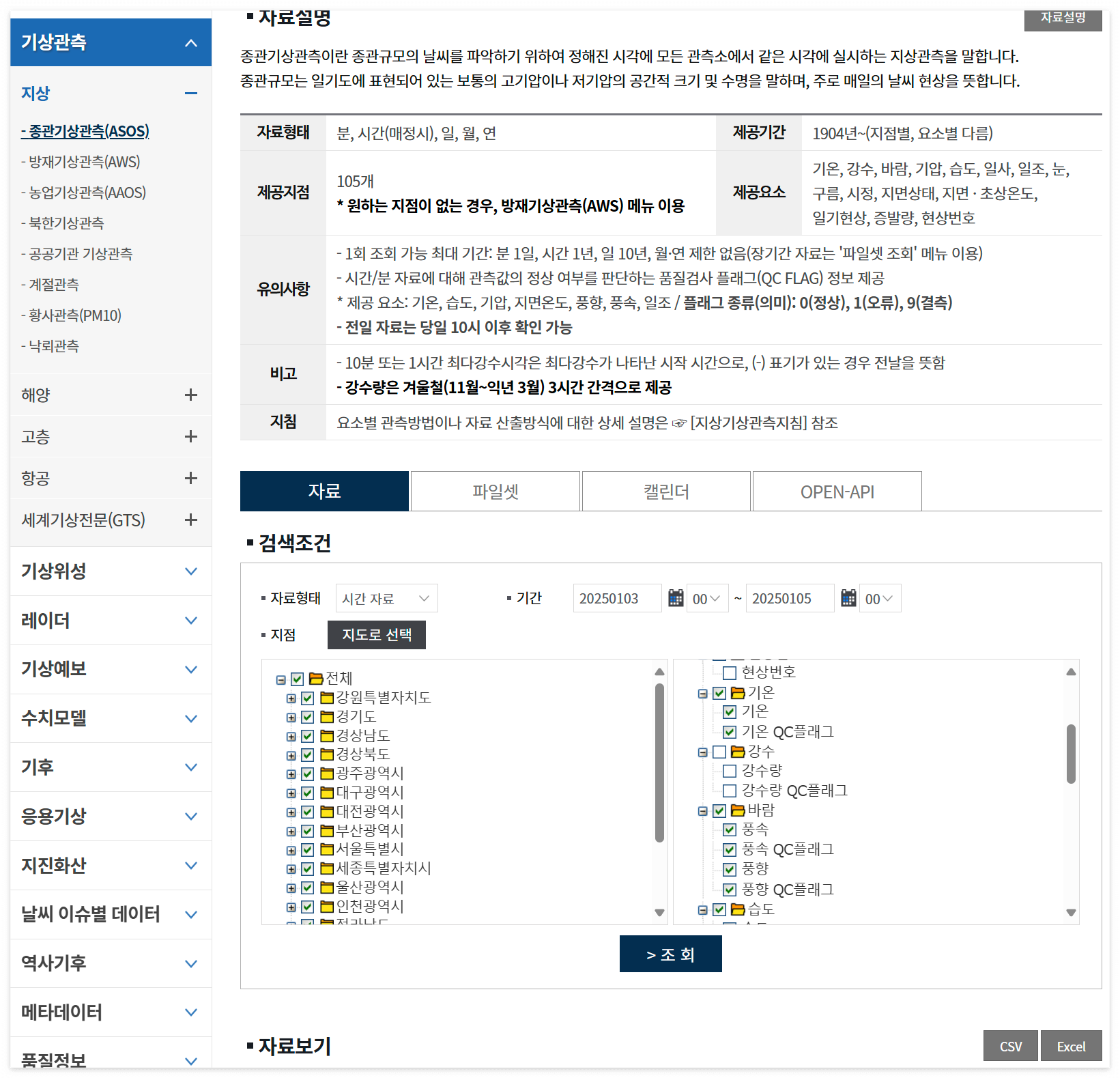 지난 회차 게시물에서는 기상청 ASOS 장비의 지점 분포에 관한 메타 자료를 기상자료 개방포털 웹페이지에서 CSV 파일로 수신하여 IDL에서 읽고 처리하여 지점별 분포 현황을 가시화하는 과정을 관련 예제와 함께 소개한 바 있습니다. 오늘은 ASOS 장비에서 관측된 각종 기상요소 관측값들에 대한 자료를 역시 동일한 웹페이지에서 수신하여 IDL에서 처리 및 가시화하는 작업을 시도해보고자 합니다. ASOS의 기상관측자료를 수신하는데 있어서는 일정한 기간을 정하고 그 기간 동안 ASOS 모든 지점에서 관측된 기상요소 값들이 수록된 CSV 파일의 형태로 얻어봅시다. 이를 위해서는 기상자료 개방포털 웹페이지의 해당 섹션에서 필요한 설정을 하여 자료 파일을 수신하면 됩니다.
