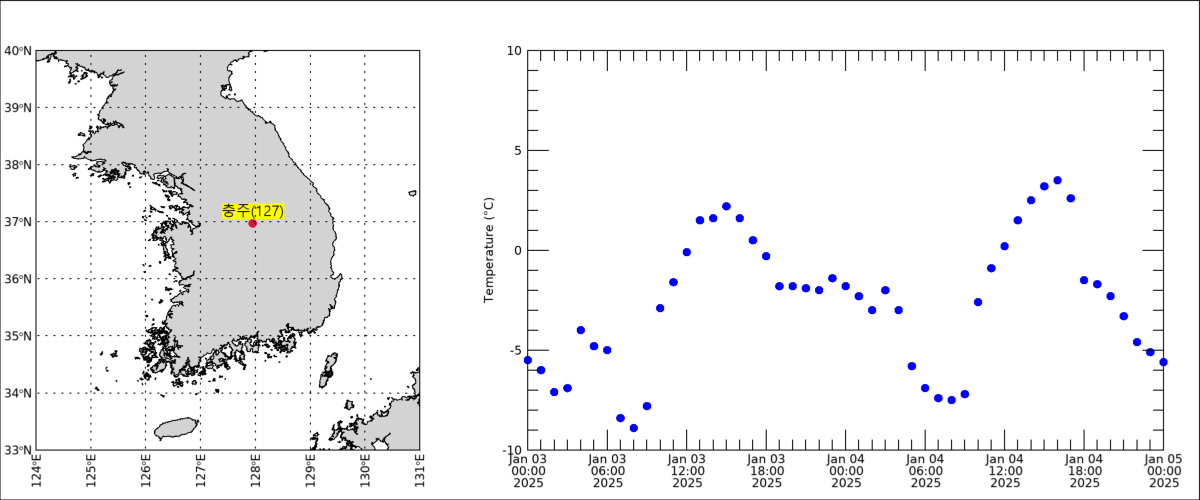 이와 같이 특정한 지점을 정해놓고 그 지점에 대한 기온 값의 시계열 변화를 플롯의 형태로 나타내면서 그 지점의 위치도 지도와 함께 표시할 수 있습니다. 만약 다른 지점에 대한 결과를 보려면 맨 처음에 정의했던 num 변수의 값만 원하는 지점의 번호로 변경해주면 됩니다. 예를 들어 다음과 같이 그 값을 101로 변경하여 전체 과정을 다시 실행하면 춘천 지점에 대한 결과 그림을 얻을 수 있습니다.