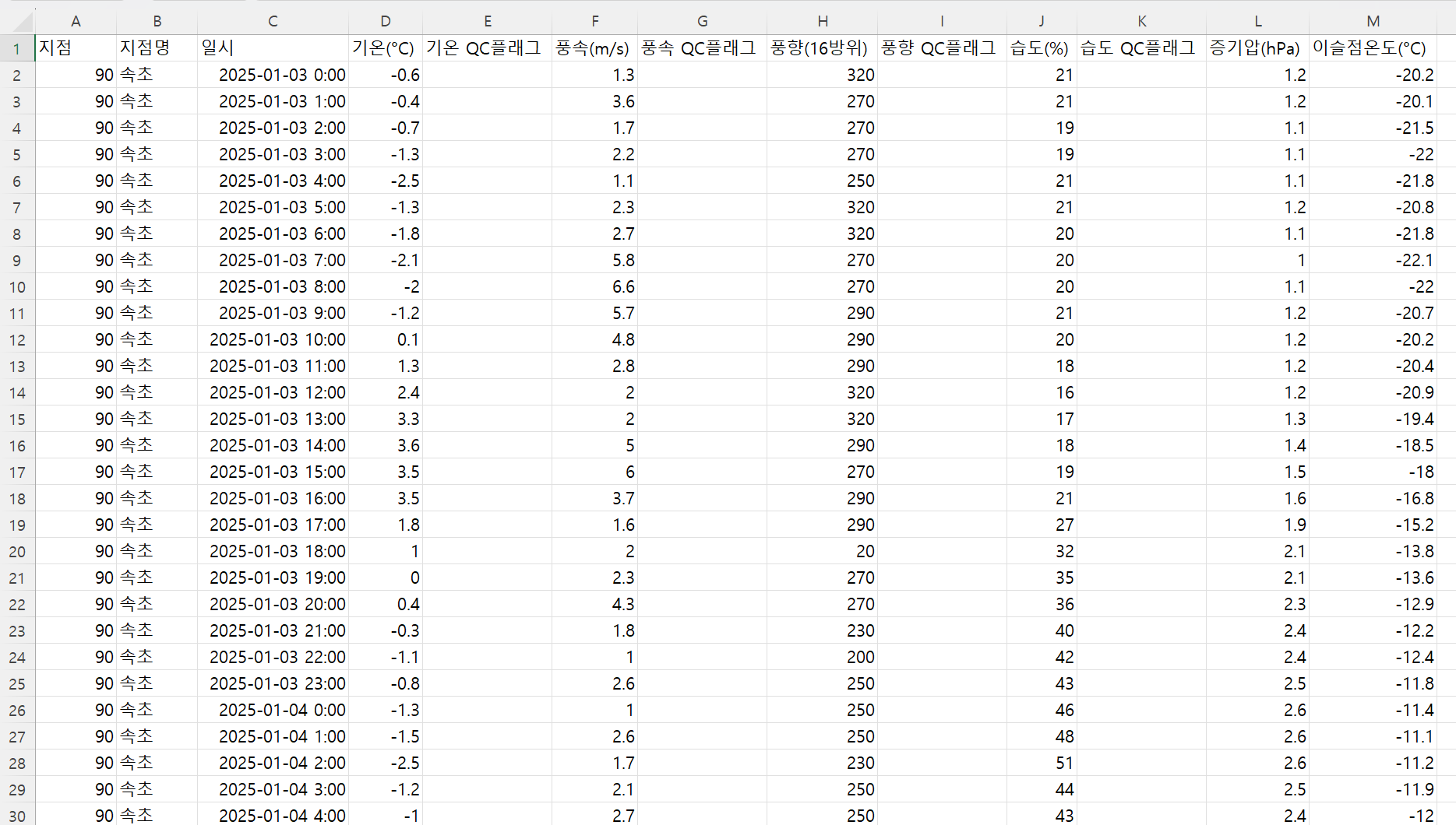 즉 이와 같이 종관기상관측(ASOS) 자료 섹션에서 지점은 전체로 설정하고 필요한 기상요소들을 체크하면서 기간을 적절히 설정해준 다음 CSV 버튼을 누르면 됩니다. 위의 예를 보면 먼저 기간은 2025년 1월 3일 00시부터 1월 5일 00시까지로 설정하였습니다. 그리고 기상요소들은 기온, 바람, 습도를 체크하였습니다. 관측값들의 시간 간격은 1시간입니다. 이렇게 하면 ASOS 97개 전 지점들에 대하여 2025년 1월 3일 00시부터 1월 5일 00시까지 기온, 바람(풍향 및 풍속), 습도 관측값들이 1시간 간격으로 수록된 CSV 파일을 얻을 수 있습니다. 제가 실제로 이러한 방식으로 입수한 CSV 파일을 엑셀로 열어본 모습은 다음과 같습니다. 물론 전체 내용은 꽤 길기 때문에 극초반부만 본 모습입니다.