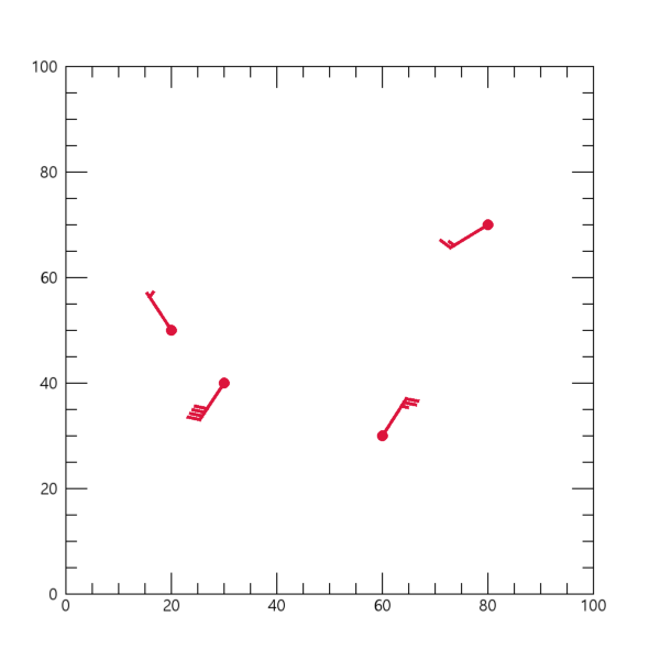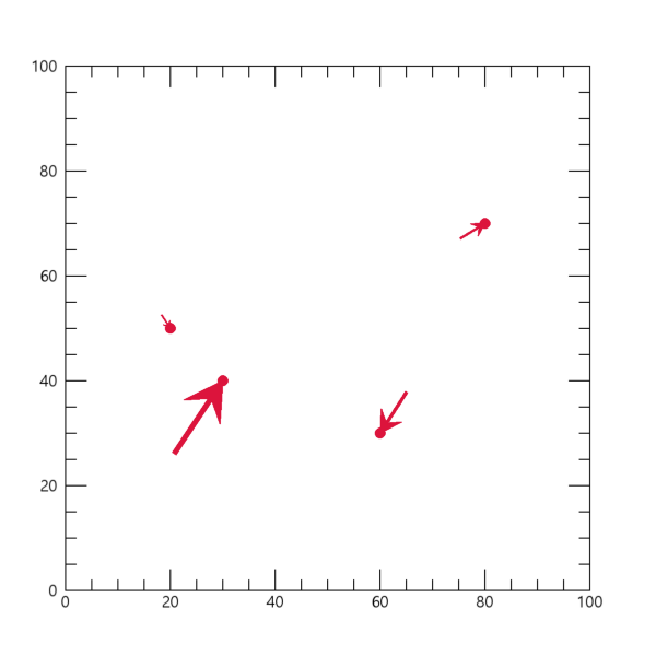 여기서는 VECTOR 함수를 사용하는 것 외에도 SCATTERPLOT 함수도 추가로 사용하여 각 지점의 위치를 점으로 표시해보았습니다. 그리고 VECTOR 함수에서 DATA_LOCATION 속성을 2로 설정하여 화살표들이 각 지점별 위치로 향하는 방식으로 표시되도록 하였습니다. 그리고 화살 머리의 크기가 화살의 길이와 연동되도록 하기 위하여 /HEAD_PROPORTIONAL 키워드도 사용하였습니다. 이러한 과정에 의하여 표출된 그림은 다음과 같습니다.