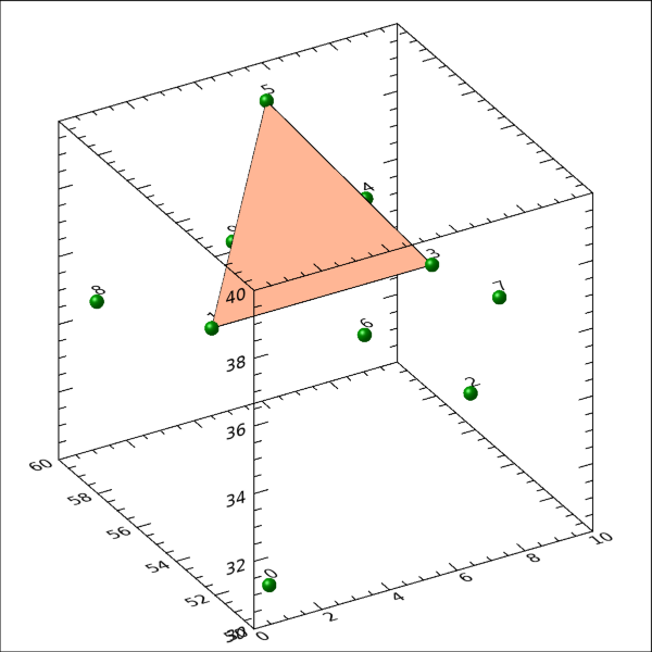 그런데 지난번 2차원 데이터에 대한 예제와 비교하면 내용이 좀 더 복잡해보이는 감은 있습니다. 이 값들은 대체 뭘까요? 원래 3차원 다각형(Polygon)은 개별 단위 요소에 해당되는 삼각형의 면(face)들 여러 개로 구성됩니다. 그래서 위에서 산출된 t가 3x14의 구조를 갖는 배열이라는 것은 QHULL에 의하여 산출된 최대 크기 다각형이 14개의 삼각형 면들로 구성된다는 의미입니다. 이 때 각각의 삼각형 면은 3개의 꼭지점들(vertices)로 구성됩니다. 따라서 위에서 숫자들로 출력된 내용 한 줄은 삼각형인 각 면을 구성하는 3개의 포인트들에 대한 인덱스 번호들입니다. 예를 들어 첫번째 라인의 0, 6, 8은 앞서 정의된 10개의 포인트들 중 첫번째, 일곱번째, 아홉번째 포인트를 뜻하며 이 포인트들로 구성되는 삼각형의 면이 최대 크기 다각형을 구성하는 14개의 면들 중 하나임을 뜻합니다. 그러면 이러한 삼각형의 면(face)이 실제로 어떻게 위치하는가를 살펴보기 위하여 이 면의 좌표값들을 얻고 표출도 해봅시다. 그 과정은 다음과 같습니다.