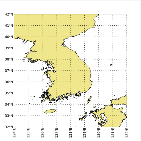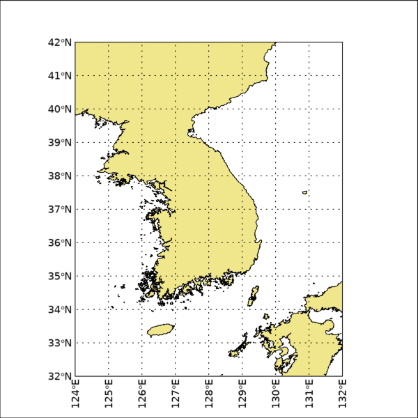 이것은 한반도를 중심으로 한 지도를 표출하는 예제입니다. 먼저 WINDOW 함수를 사용하여 600x600 크기의 그래픽 창을 띄우고, MAP 함수를 사용하여 그 위에 지도를 표출합니다. 지도의 경도 및 위도 범위는 각각 동경 124~132도 및 북위 32~42도입니다. 그리고 MARGIN 속성의 값을 0.1로 설정하여 상하좌우 여백의 크기가 모두 0.1이 되도록 하였습니다. 이러한 내용을 실행하면 표출 결과는 다음 그림과 같습니다.