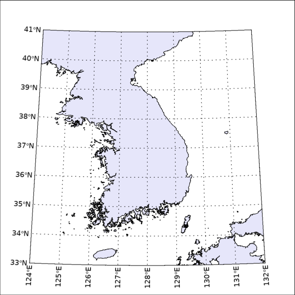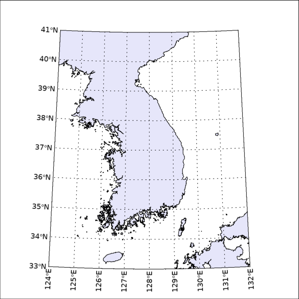 이 그림을 보면 지도의 표출에 있어서 상하좌우 여백이 모두 0.1이 된 것을 확인할 수 있습니다. 물론 위의 그림을 보면 지도의 모습이 가로 방향으로 다소 길쭉하게 늘어난 것 같은 느낌이 들 수도 있겠지만, 이런 부분은 그래픽 창의 크기 및 지도 자체의 경위도 범위에 대한 좀 더 디테일한 설정을 통하여 유저가 다듬어나가야 할 것입니다. 이와 같이 지도의 표출에 있어서 ASPECT_RATIO 속성의 설정을 어떻게 할 것이냐의 문제는 다른 투영법을 사용할 경우에도 마찬가지로 신경을 써야 합니다. 그러면 이번에는 LCC(Lambert Conformal Conic) 투영법의 지도를 표시하는 예제를 살펴봅시다. 그 과정은 다음과 같습니다.