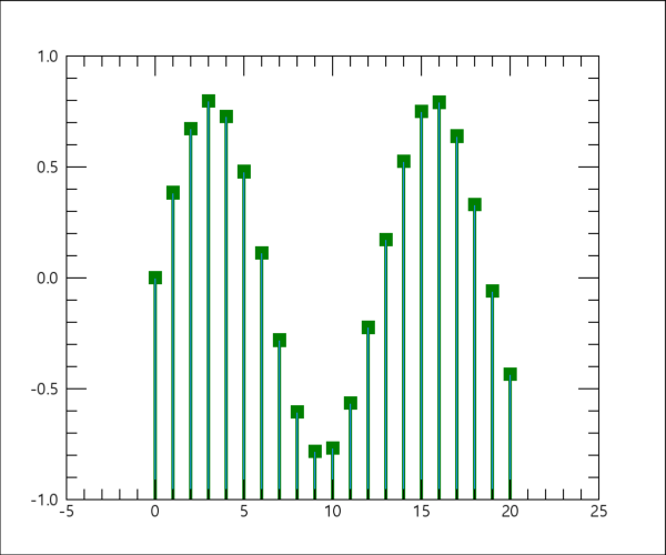 일단 여기까지는 PLOT 함수를 사용하여 데이터 포인트들을 정사각형의 기호로 표시하였고, 줄기에 해당되는 부분은 아직 구현되지 않은 상태입니다. 이제 줄기 부분을 표시해야 하는데 이를 위하여 BARPLOT 함수를 추가로 사용하면 됩니다. 이를 위하여 다음과 같은 내용을 추가합니다.
