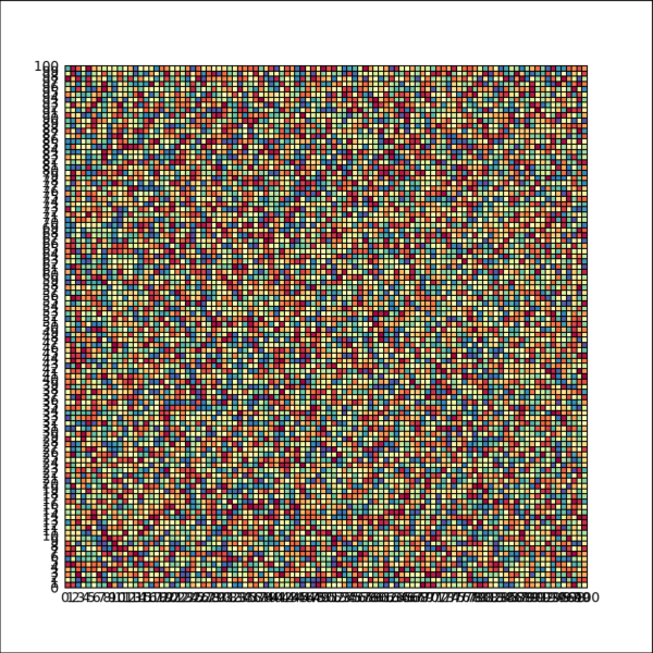 물론 크기가 더 큰 배열에 대해서도 이러한 방식의 표출 자체는 가능합니다. 하지만 배열 크기가 크면 아무래도 격자들이 많아지면서 격자선들이 차지하는 공간이 더 늘어나기 때문에 개별 화소의 모습이 상대적으로 가려질 가능성이 높습니다. 예를 들어 다음과 같이 100x100의 크기인 배열을 대상으로 하게 되면 그 결과는 다음 그림과 같습니다(격자선의 두께는 디폴트인 1로 처리합니다).