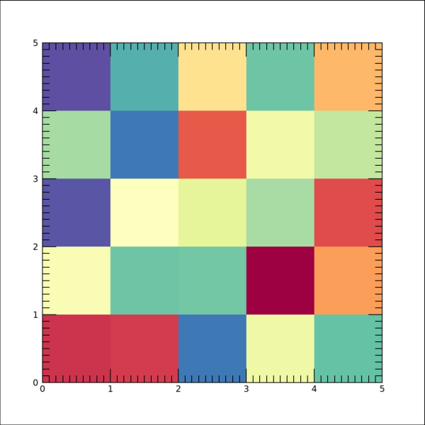거의 이 정도까지가 그나마 가독성이 보장되는 한계일 것 같습니다. 물론 이 그림의 경우는 각 축의 라벨 문자들이 너무 붙어서 겹쳐보이는 문제도 있기 때문에 이를 해소하기 위한 추가적인 코딩이 더 필요할 것으로 보이긴 합니다. 그리고 만약 크기가 더 큰 배열(200x200, 300x300 또는 그 이상)을 대상으로 하게 되면 격자선을 표시하지 않고 그냥 통상적인 방식으로 화소들만 보이도록 하는 것이 더 바람직할 것입니다. 어쨌든 크기가 그다지 크지 않은 2차원 데이터를 이미지의 형태로 표출하면서 각 화소별로 격자로 둘러싸는 방식의 표출이 필요할 경우에는 오늘 소개된 방법을 참조해보시면 좋을 것 같습니다.