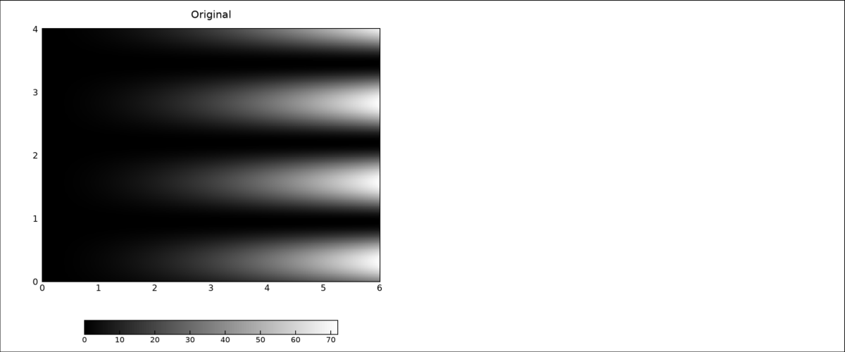 여기서 정의된 data는 601x401의 구조를 갖는 2차원 배열이며 값 범위는 0~72가 됩니다. 그리고 x는 X축 방향의 601개의 격자값들로 구성된 1차원 배열이고 y는 Y축 방향의 401개의 격자값들로 구성된 1차원 배열이 됩니다. 그런데 xx의 경우는 X축 방향으로 증가하는 601개의 격자값들이 2차원적으로 분포하도록 인위적으로 재구성된 601x401 구조의 배열이 됩니다. 또한 yy의 경우는 Y축 방향으로 증가하는 401개의 격자값들이 2차원적으로 분포하도록 인위적으로 재구성된 601x401 구조의 배열이 됩니다. 배열 xx를 구성하는 값들의 구조를 대략적으로 본다면 다음과 같습니다.