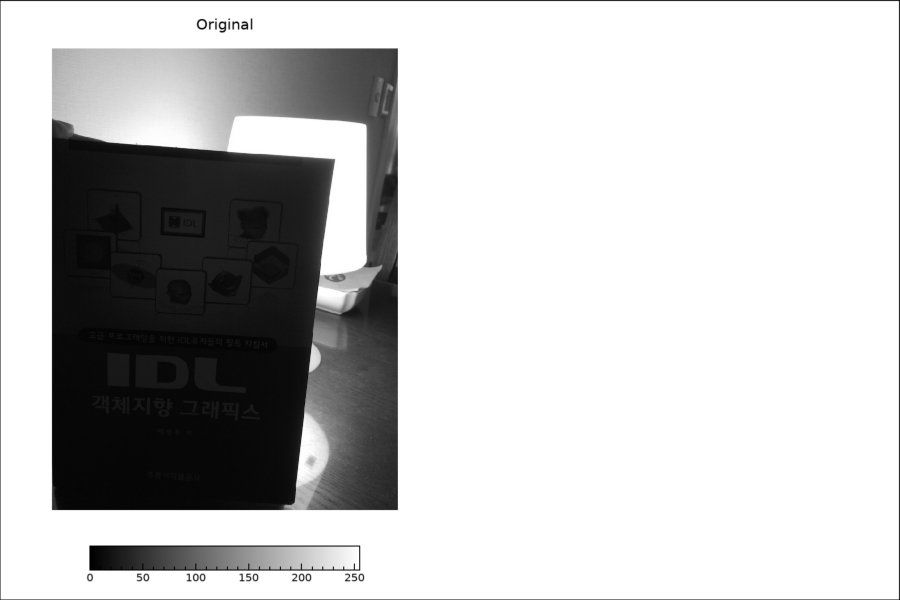 사실 원본 이미지는 컬러이긴 하지만 여기서는 처리 작업의 편의를 위하여 READ_JPEG 명령을 GRAYSCALE 키워드와 함께 사용하여 RGB가 아닌 단색광 이미지 데이터로 읽었습니다. 그러면 data 배열은 734x979의 형태를 갖는 2차원 배열이 됩니다. 그리고 이 배열은 바이트형 배열로서 화소값들의 범위는 0~255가 됩니다. 이제부터 진행할 작업은 지난 회차 게시물의 내용과 맥락은 동일합니다. 즉 가로 방향으로 길쭉한 그래픽 창을 띄워서 방금 얻은 2차원 배열에 대한 이미지를 왼쪽에 띄우고 잠시후 감마 보정을 적용한 결과 이미지를 오른쪽에 띄우고자 합니다. 먼저 그래픽 창의 생성 및 이미지 표출까지의 과정은 다음과 같습니다.