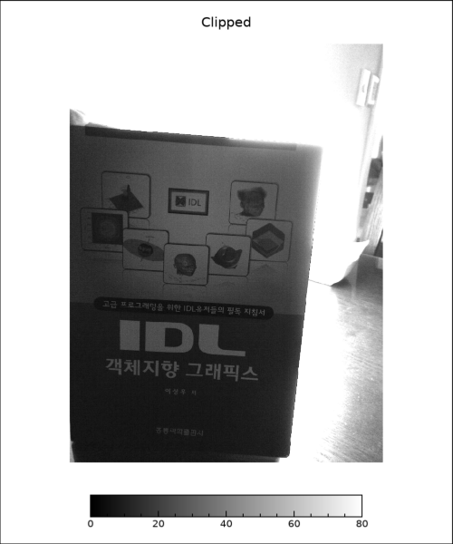 여기서는 원본 이미지 배열인 data에 대하여 클리핑 기법을 적용하여 화소값이 80 이하인 화소들에 대하여 바이트스케일링이 적용되도록 하고 80 이상인 화소들에 대해서는 모두 80으로 통일되도록 처리하였습니다. 그리고 원래 사용하던 컬러테이블 데이터인 ct는 감마 보정에 의하여 이미 변형되었기 때문에 0번 컬러테이블을 원형 그대로 사용하기 위하여 RGB_TABLE 속성을 0으로 설정하였음을 유의할 필요가 있습니다. 이와 같이 클리핑 처리에 의하여 표출된 결과를 보면 다음 그림과 같습니다.
