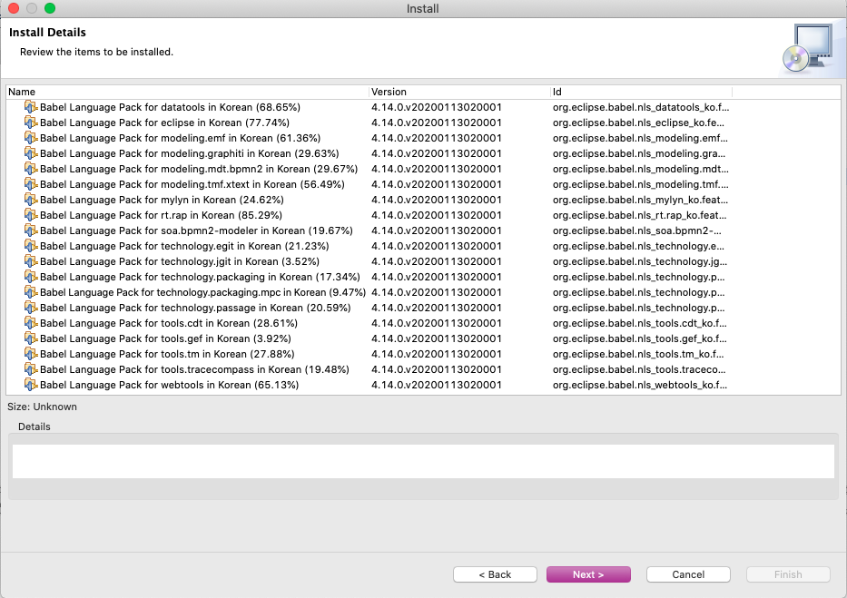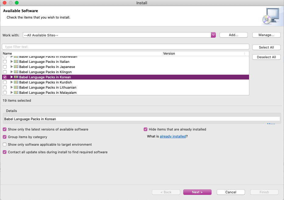 이렇게 항목을 선택하면 아마 약간의 시간 동안(네트웍 상태에 따라 달라질 수 있습니다) 서치를 한 뒤에 다음과 같이 목록창에 다수의 항목들이 나타날 것입니다. 여기서 항목들을 보다보면 다음 그림과 같이 Babel Language Packs in Korean이라는 항목이 보일 것입니다. 여기서 한가지 재미있는 것은 Korean 바로 위에 Klingon이란 항목이 보이는데요. 아시는 분들은 아시겠지만 스타트렉(Star Trek)이라는 SF 영화/드라마에 등장하는 외계종족인 Klingon 족의 언어입니다(아마 미드 빅뱅이론을 보신 분들도 익숙하실 것 같습니다). 이게 실제로 어엿한 언어 체계를 갖고 있다고 합니다. 궁금하신 분들은 받아서 설치해보셔도 됩니다(저는 안해봤습니다).