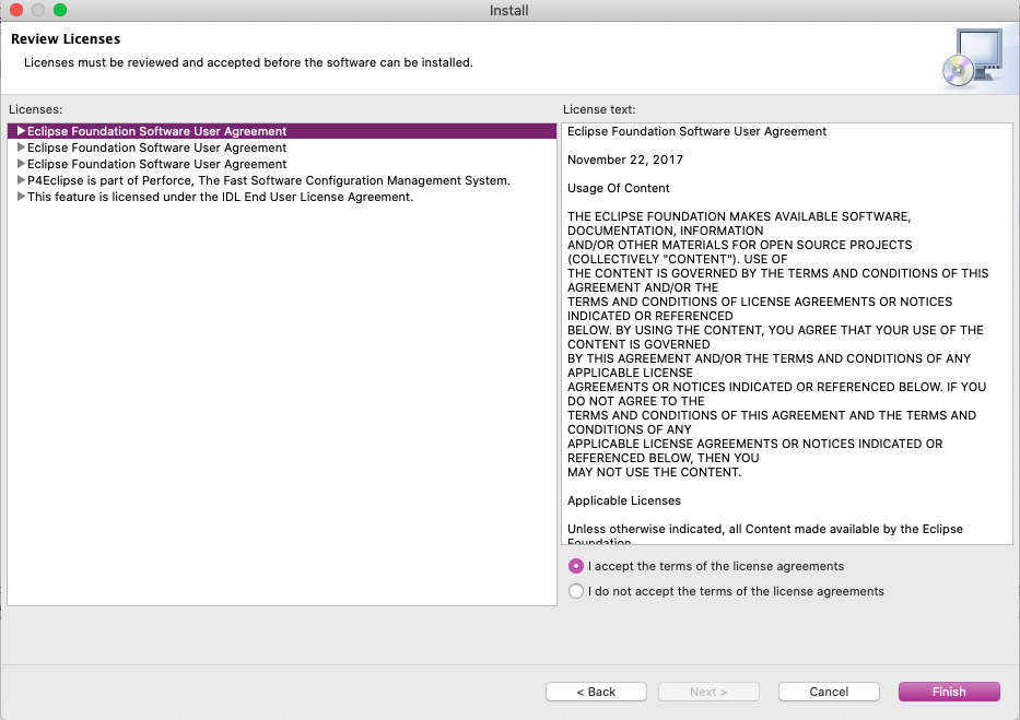 그런데 본격적인 설치에 앞서서 다음과 같이 Review License라는 제목과 함께 뭔가 약관같은 문서를 보여주면서 동의해야 진행된다고 알려줍니다. 어차피 동의를 안하면 진행 자체가 안되기 때문에 "I agree ~~~" 항목을 선택하고 Finish 버튼을 눌러줍시다.