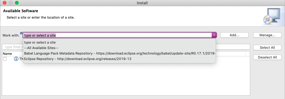 여기서 다음과 같이 Work with : type or select a site 부분의 풀다운 화살표를 누르면 몇가지 항목들이 나타나는데, 여기서 All available sites 또는 Babel Language Pack Metadata Repository 중 하나를 선택합니다. 저는 그냥 All available sites를 골랐습니다.