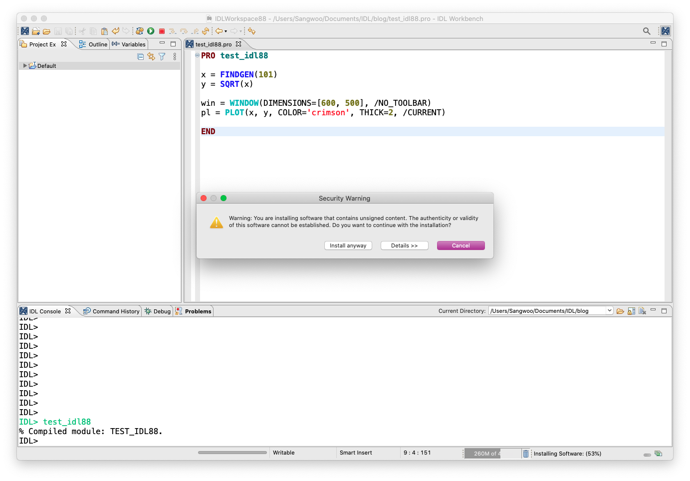 이제 언어팩의 설치 과정이 진행됩니다. 설치되는 동안에는 IDL 세션이 계속 되면서 우측 최하단에서 진행상황을 보여주는 바와 퍼센티지가 함께 표시됩니다.